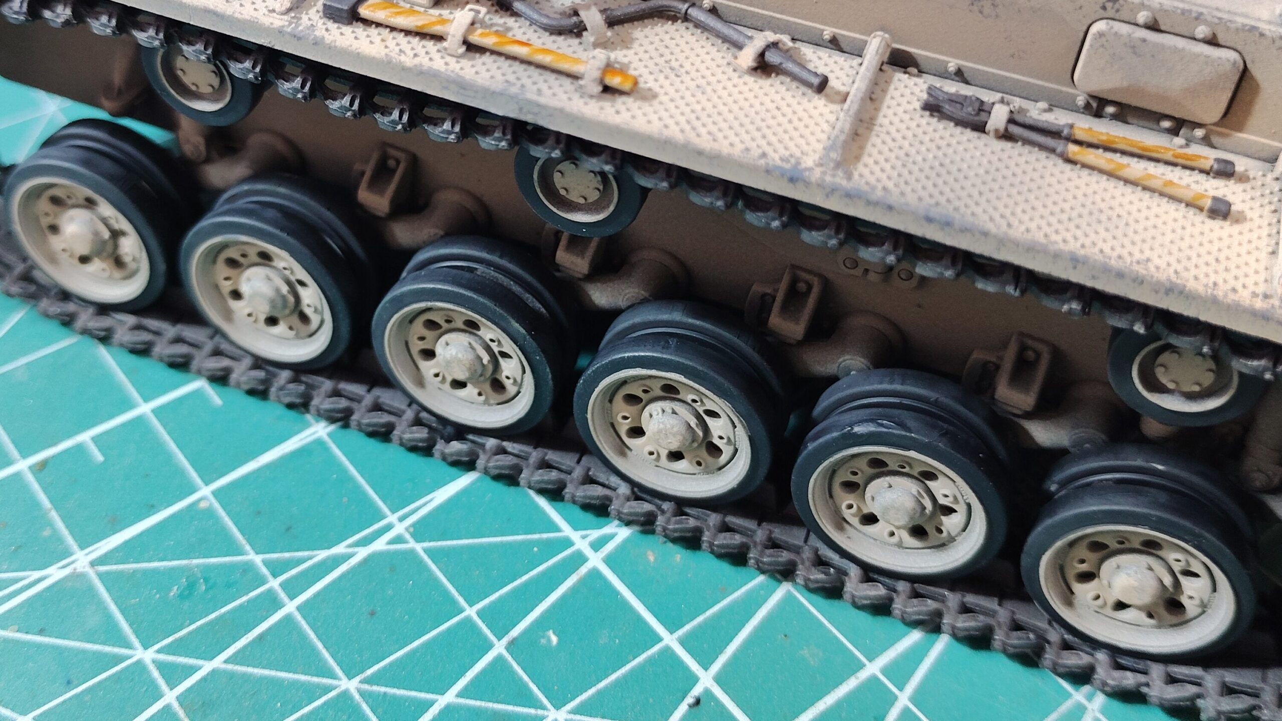 キャタピラを巻き付けた状態で塗装するのは抵抗があるかもしれませんが、下地塗装で黒を吹き付けておけば、ダークイエロー系なら砂埃のように見えるし、ジャーマングレイやオリーブドラブなどの暗い色だと下地の黒色と一体化して目立たなくなります。