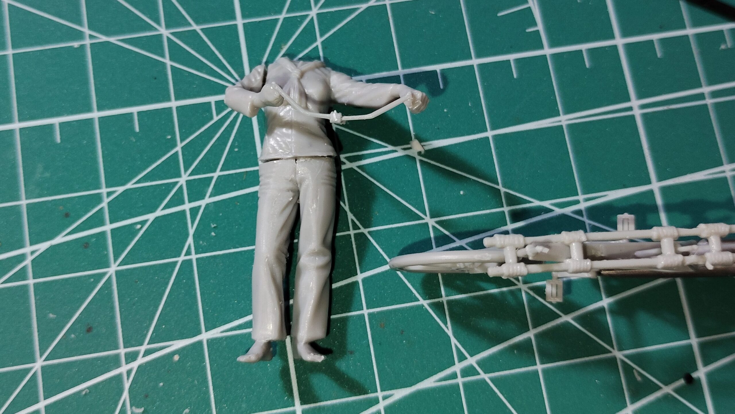自転車を立たせた状態で固定して、自転車に合わせて肩の角度を調節していきます。腕パーツや胴体パーツの接着面を削って角度や向きを自転車のハンドルに合わせます。