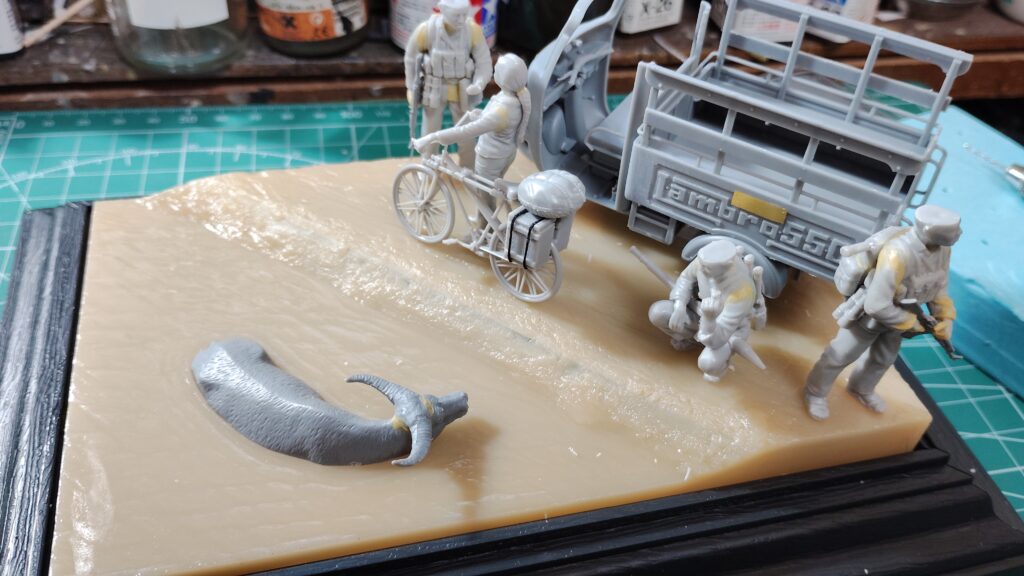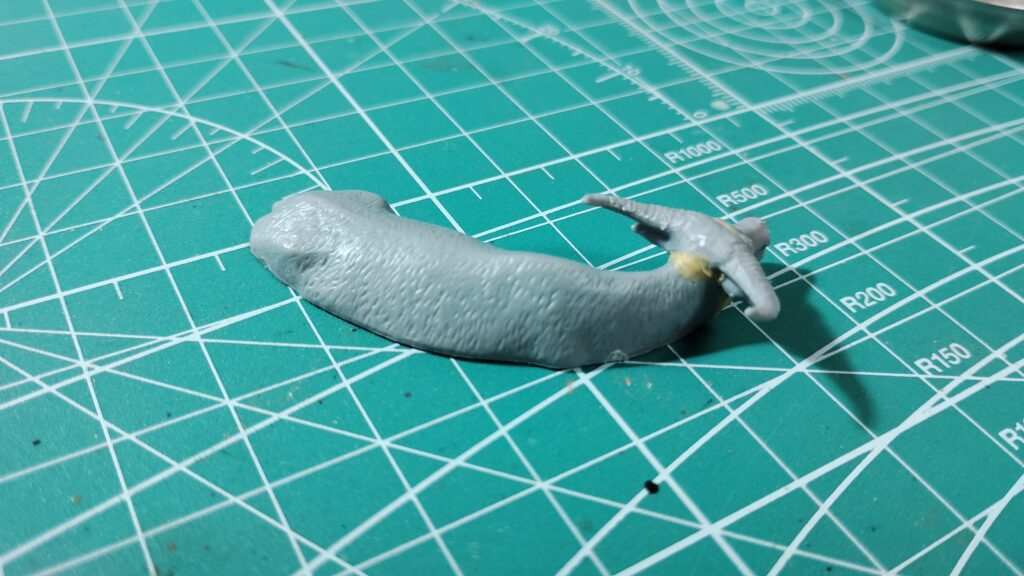 池の中で佇む水牛を製作します。パーツ数は少ないですが、動物キットはパーツ間の隙間が目立つのでエポキシパテで隙間をしっかり埋めます。