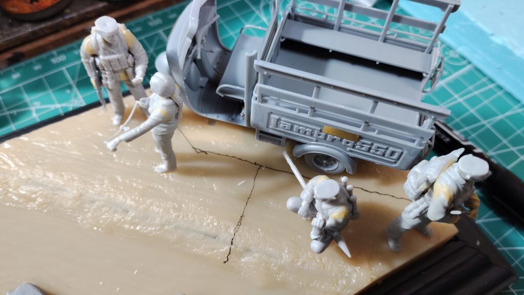 製作したフィギュアと車両を仮配置しなから、配置位置を決めていきます。