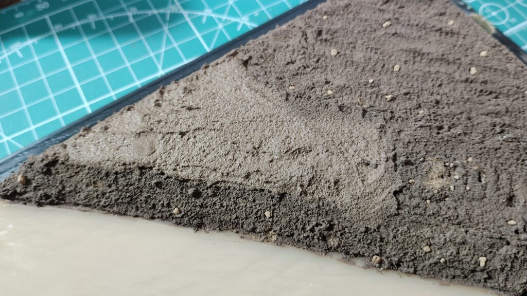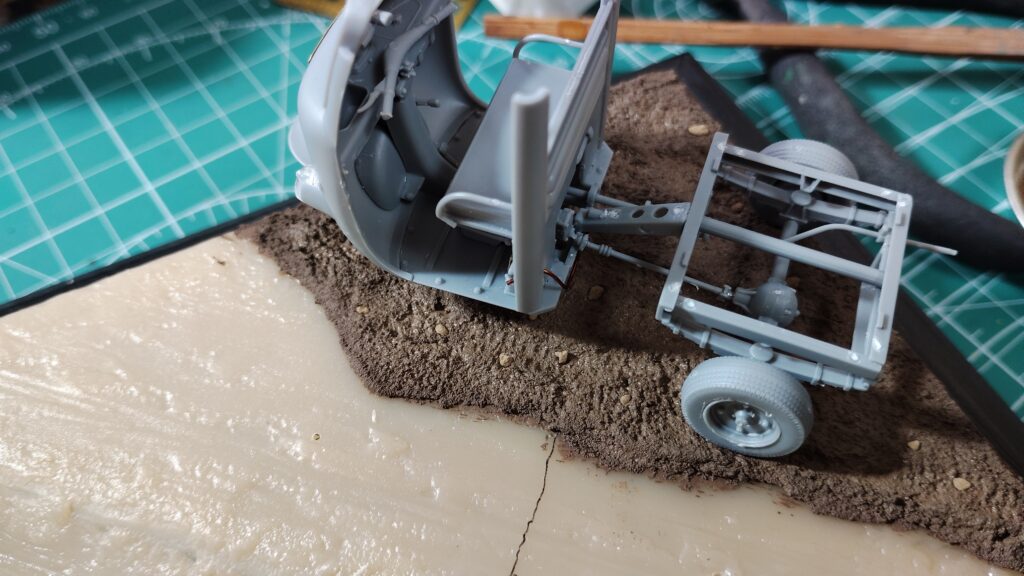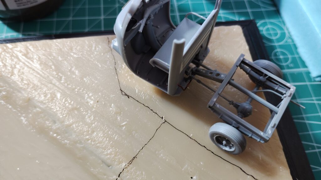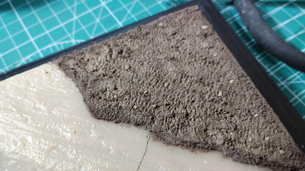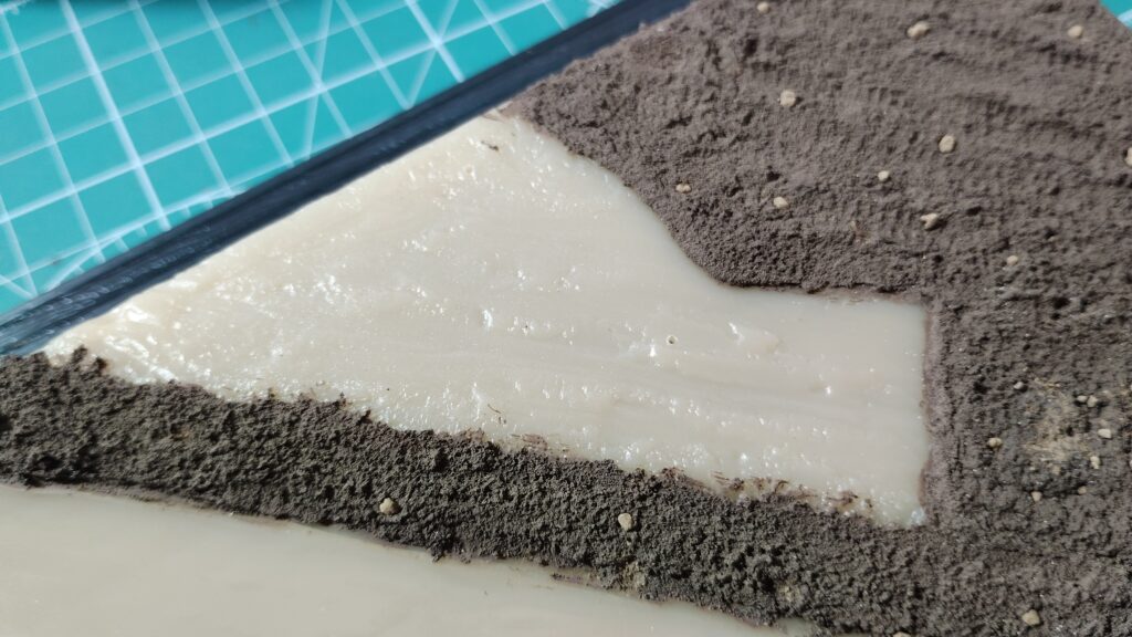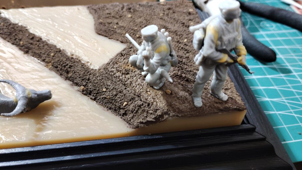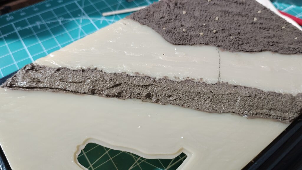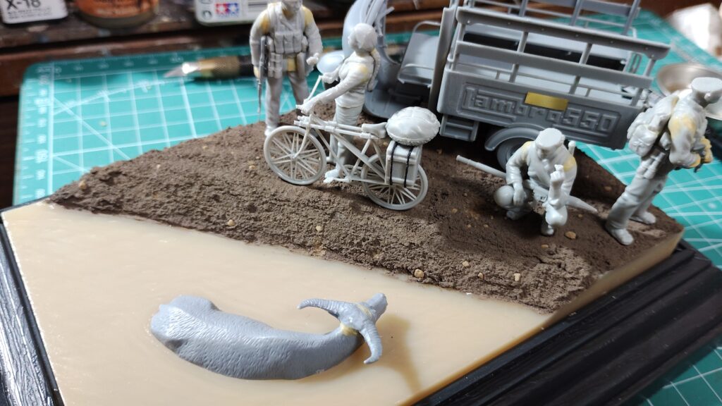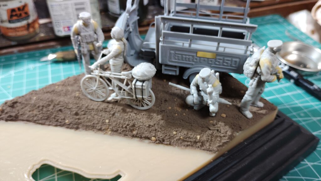 通常のジオラマなら下がスチレンボードや発砲スチロールなので、足裏に真鍮線を埋め込めこんで位置をズラしながら決めていくのですが、プラスチック製のベースだと真鍮線が刺さらないので細かく位置をズラしていくのが難しいです。