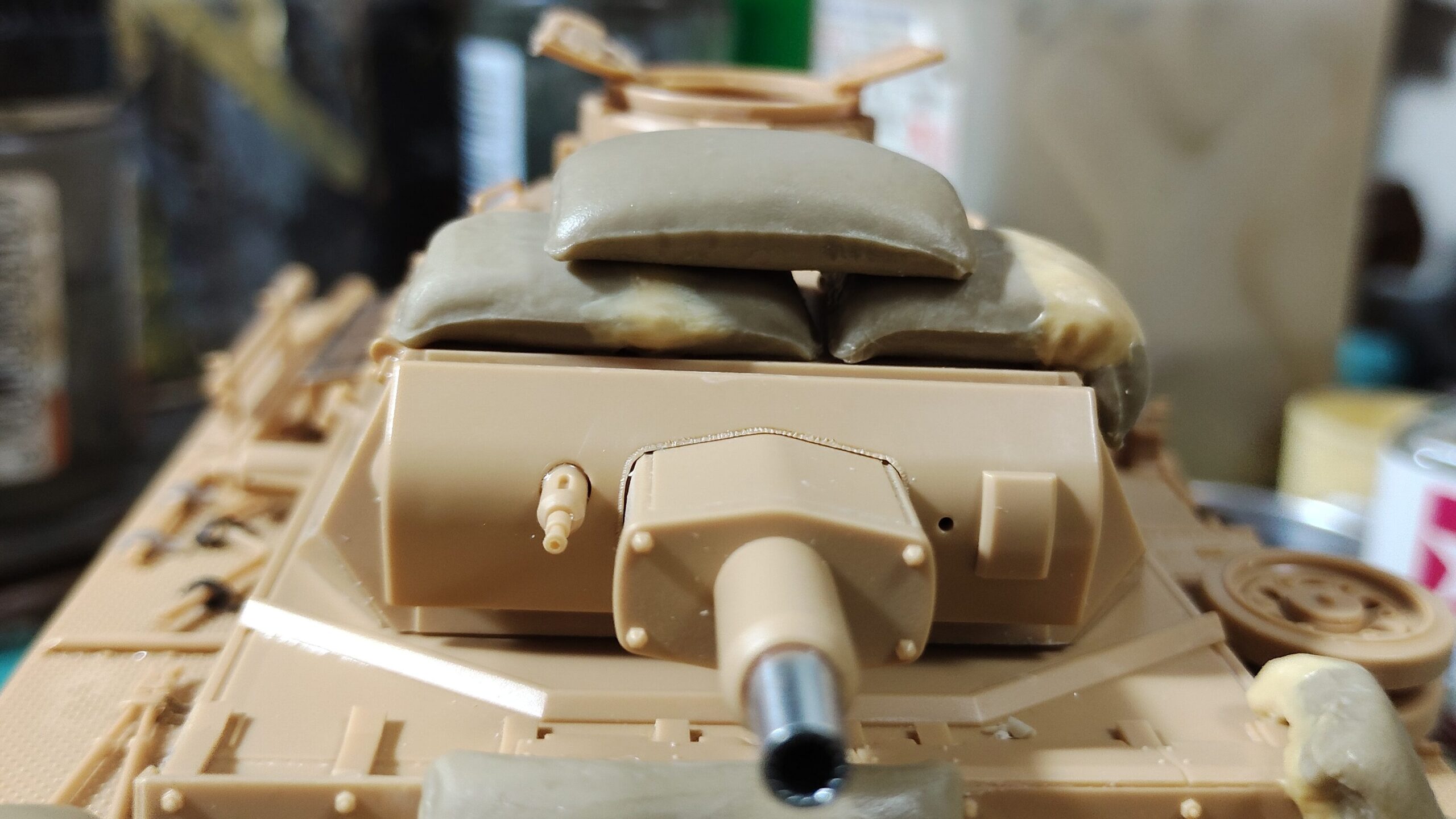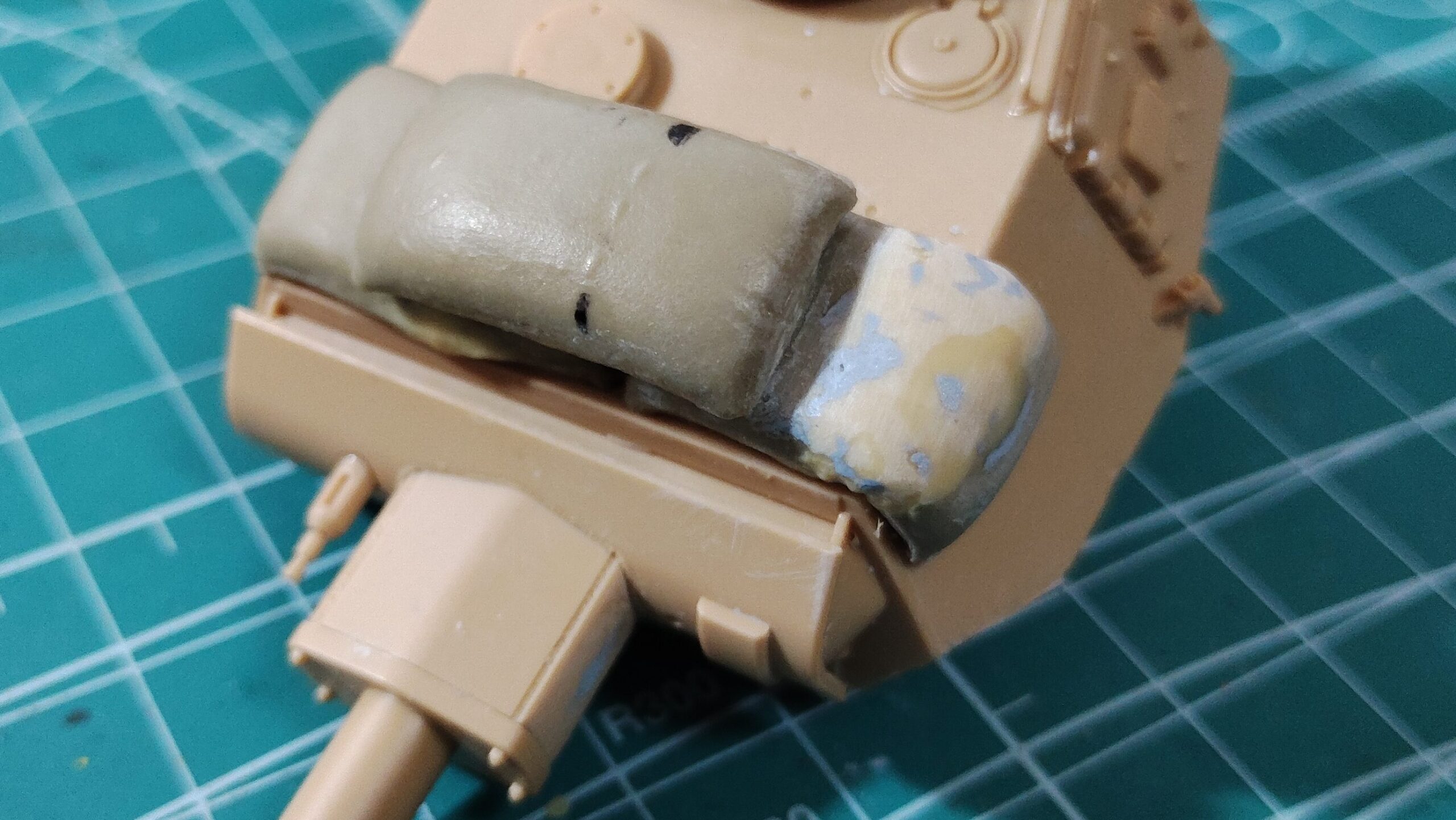 車体前部の土嚢も同様にして隙間をパテ盛り作業で埋めていきます。