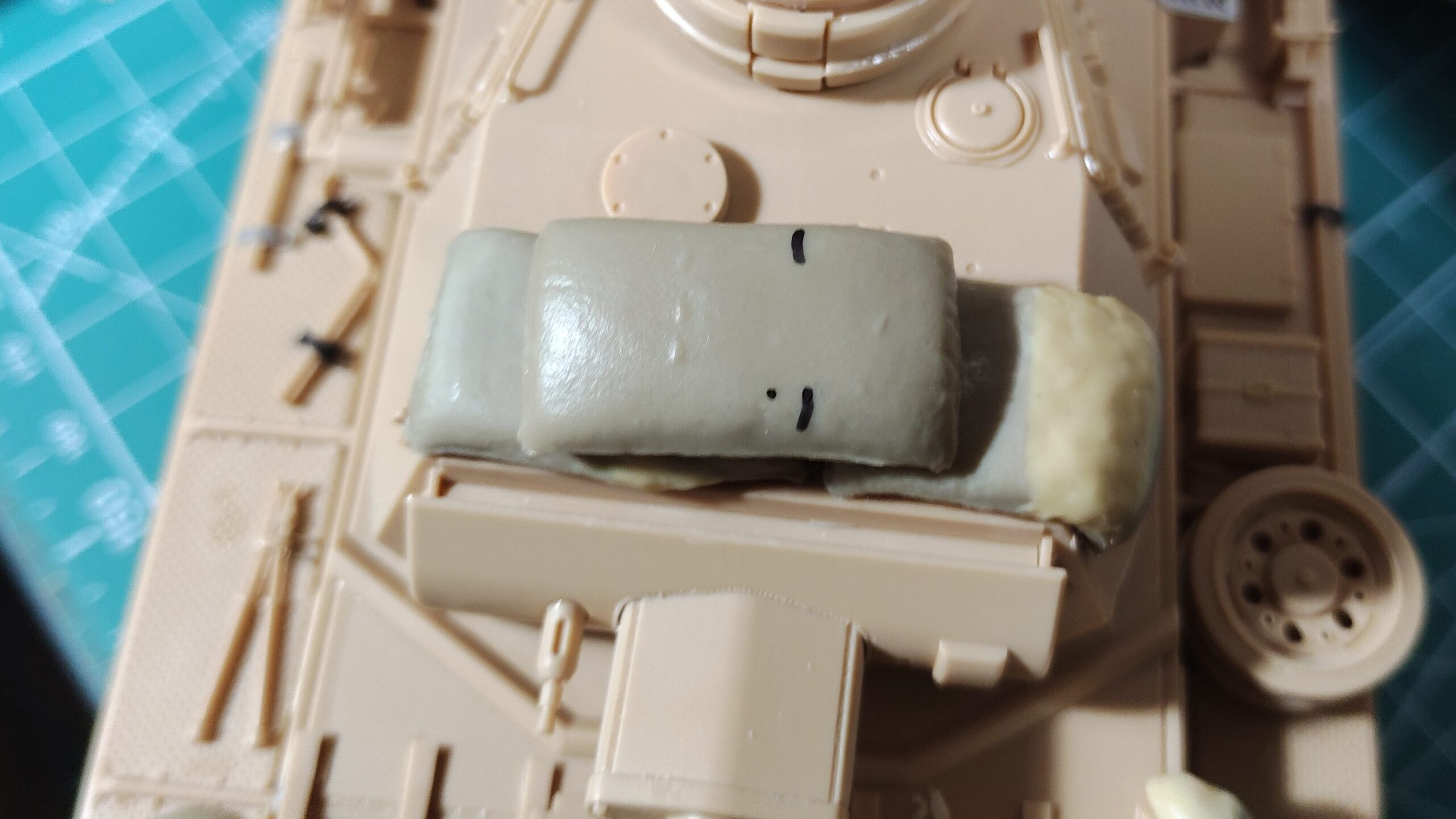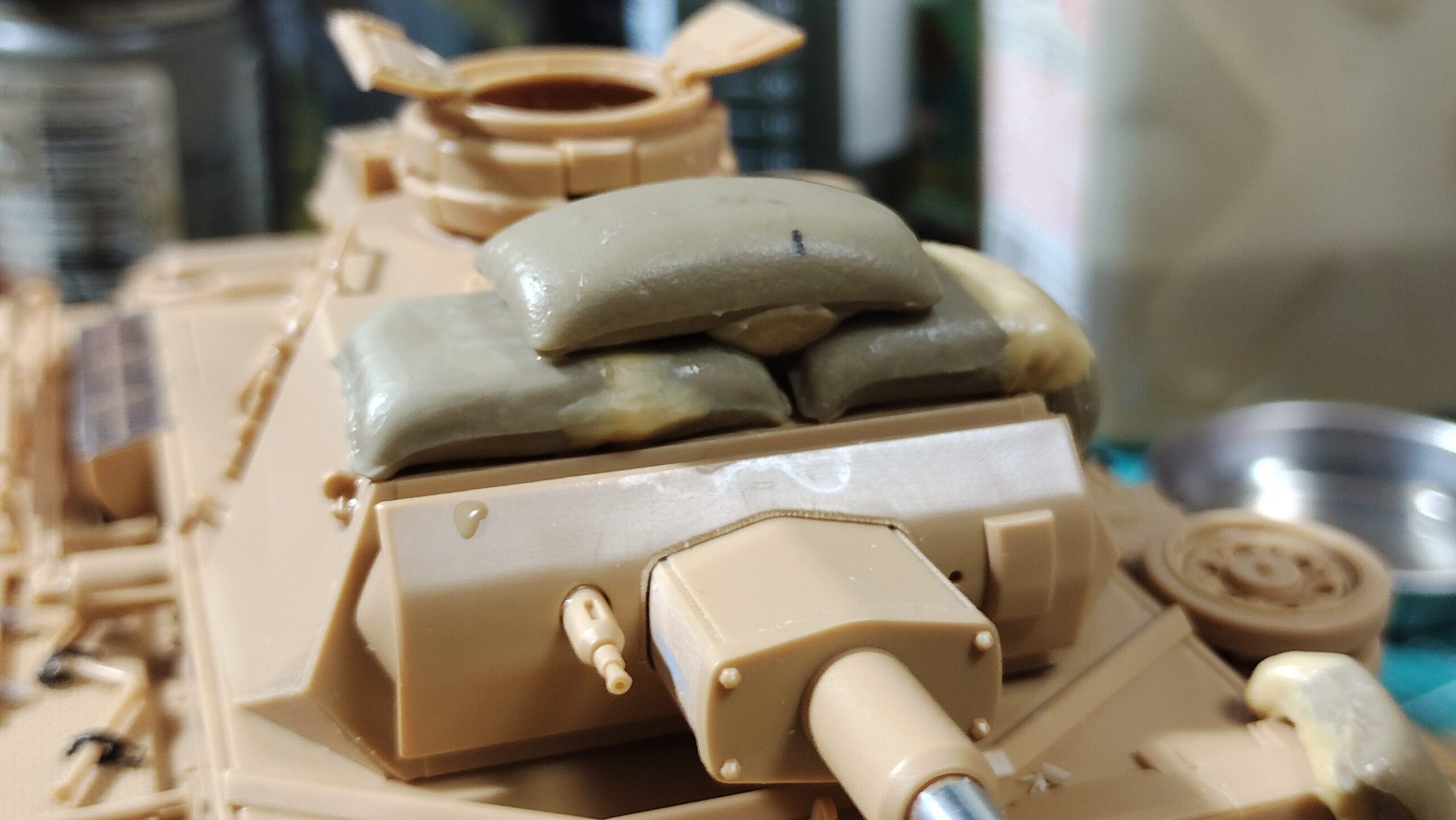 砲塔上段の土嚢を接着します。上段用の土嚢をそのまま接着すると、写真1のように下段との間に隙間が発生してしまいます。がっつり隙間が空いてしまうと土嚢の重量感が低下してしまうので、重さを感じられるようにパテで隙間を埋めます。