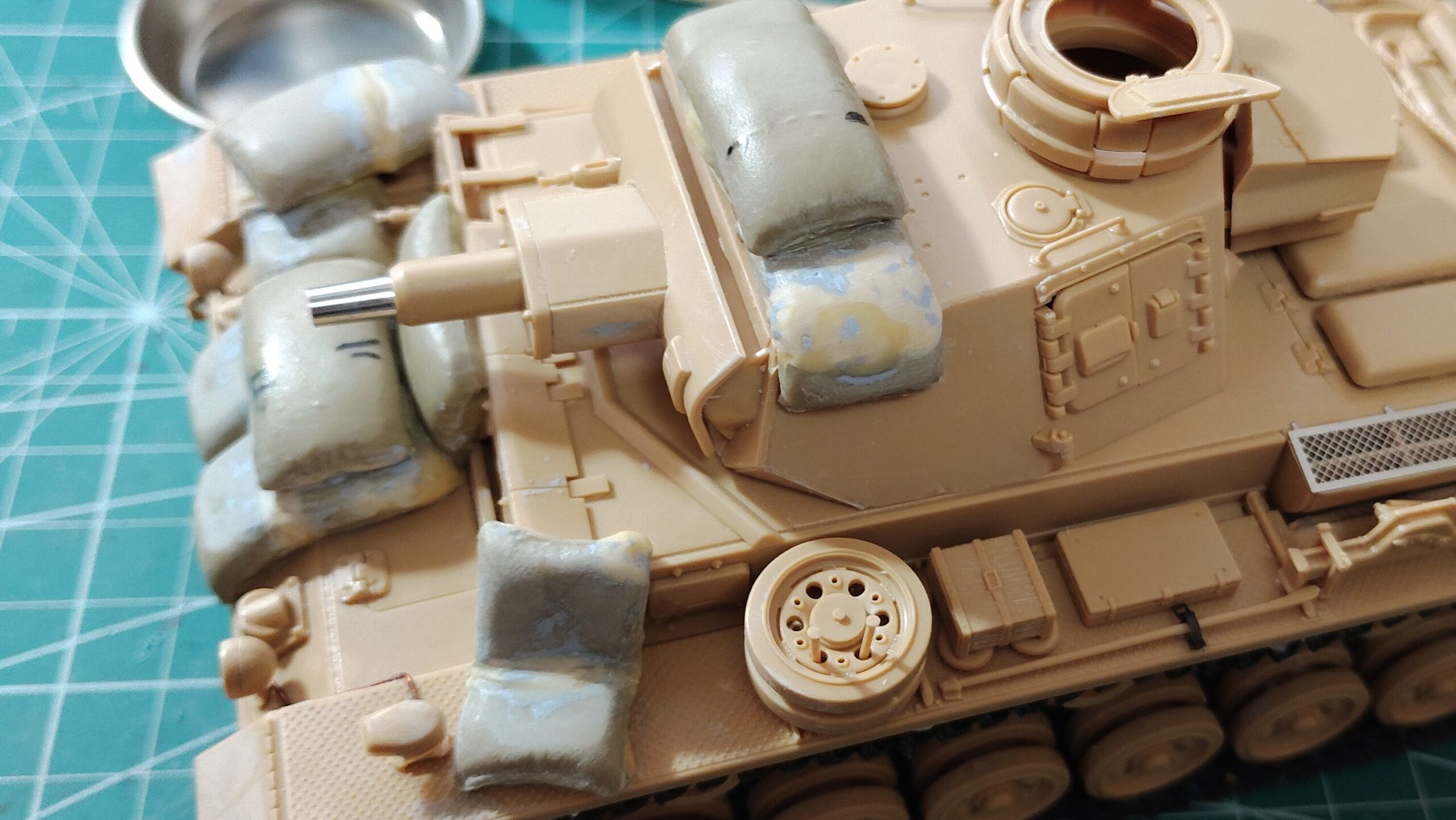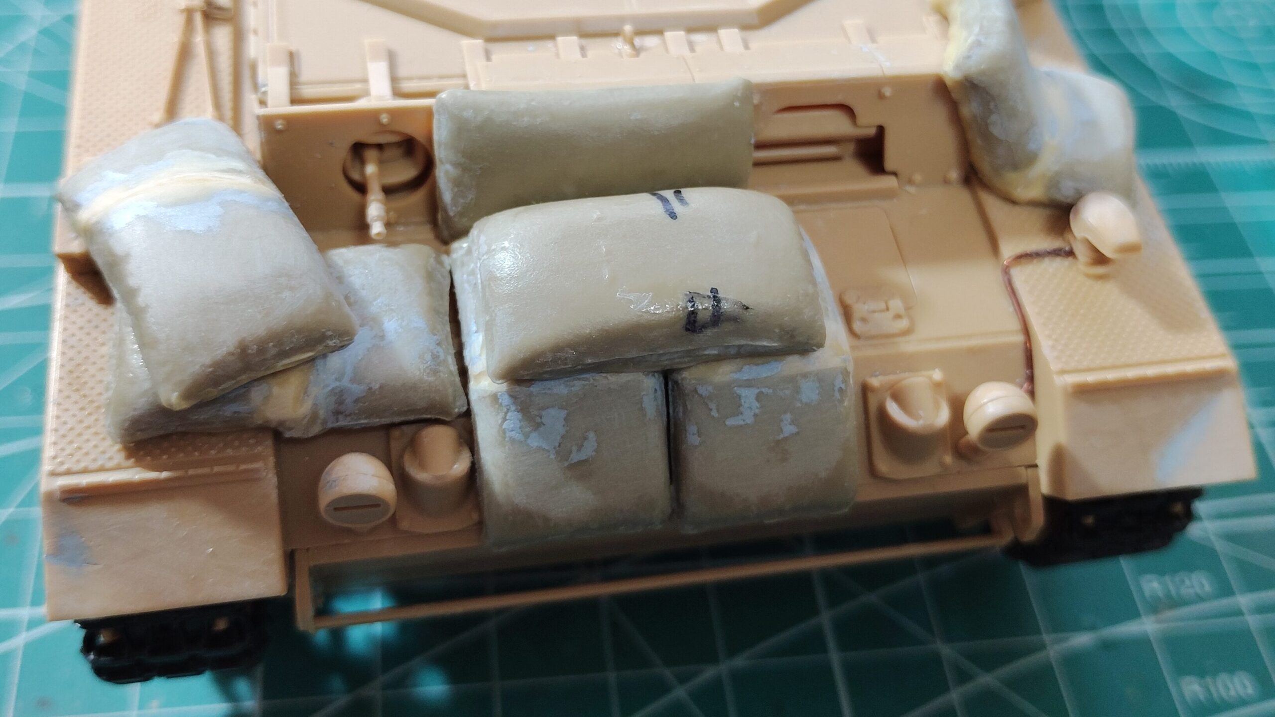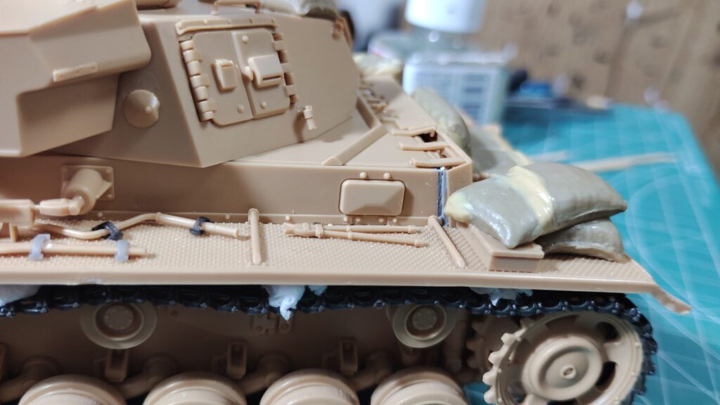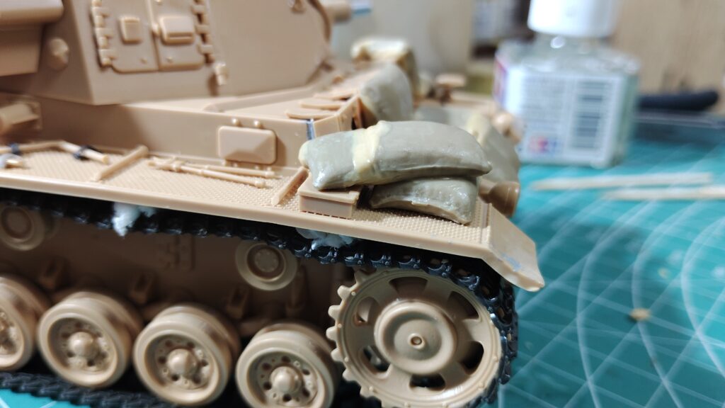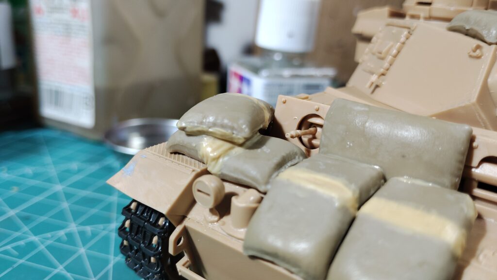 フェンダー上の土嚢は段差にカットした段差に合わせてパテを盛っていきます。カットした土嚢は車体に接着してからパテ盛りをした方が作業しやすいです。全体的に垂れ下がる感じでパテ盛りをすれば、重量感のある土嚢を表現する事ができます。